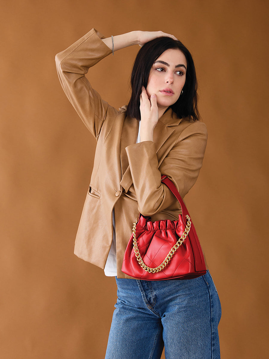 The Sydney Ruched Top Crossbody/Bucket Bag is a stylish and versatile accessory crafted from premium vegan leather. Featuring a quilted ruched design and a magnetic closure, this bag combines elegance with practicality. It includes a removable chain strap and a convertible strap for customizable carrying options, making it ideal for various occasions.