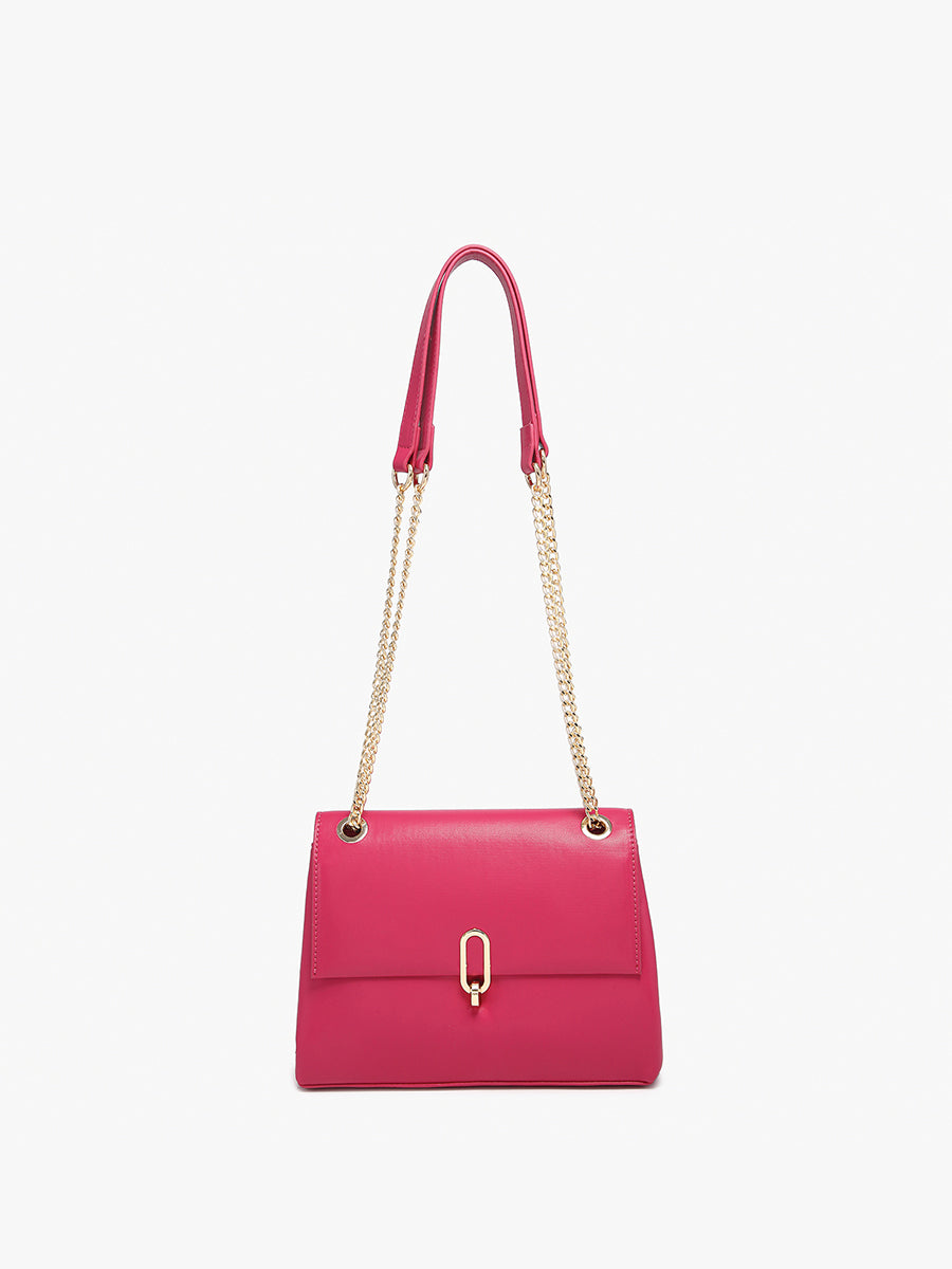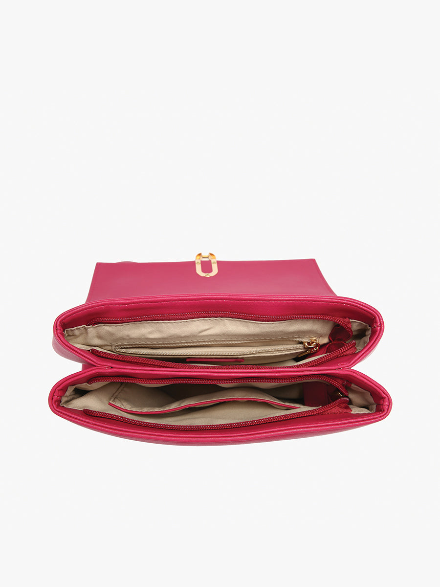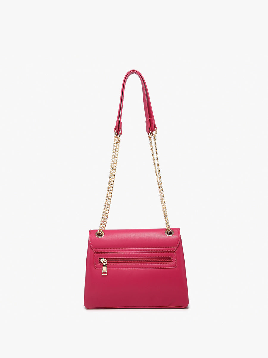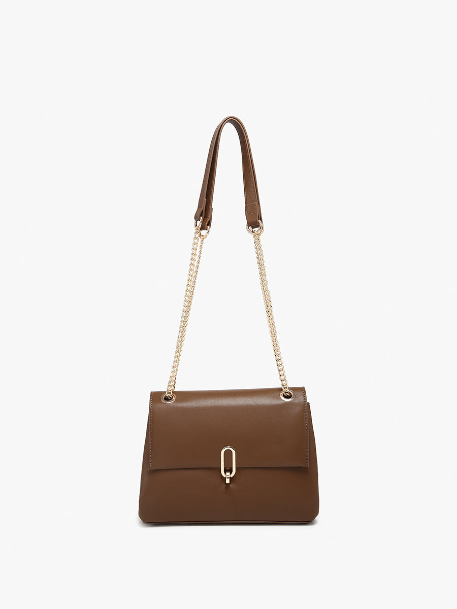 The Cannes Square Crossbody offers a sophisticated blend of function and style. This dual-compartment shoulder bag features a twist lock and zip closure for secure storage, complemented by a back zip pocket and an adjustable gold chain strap for versatile carrying options.