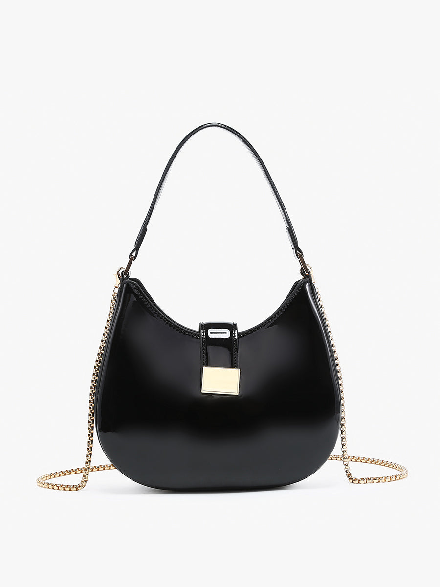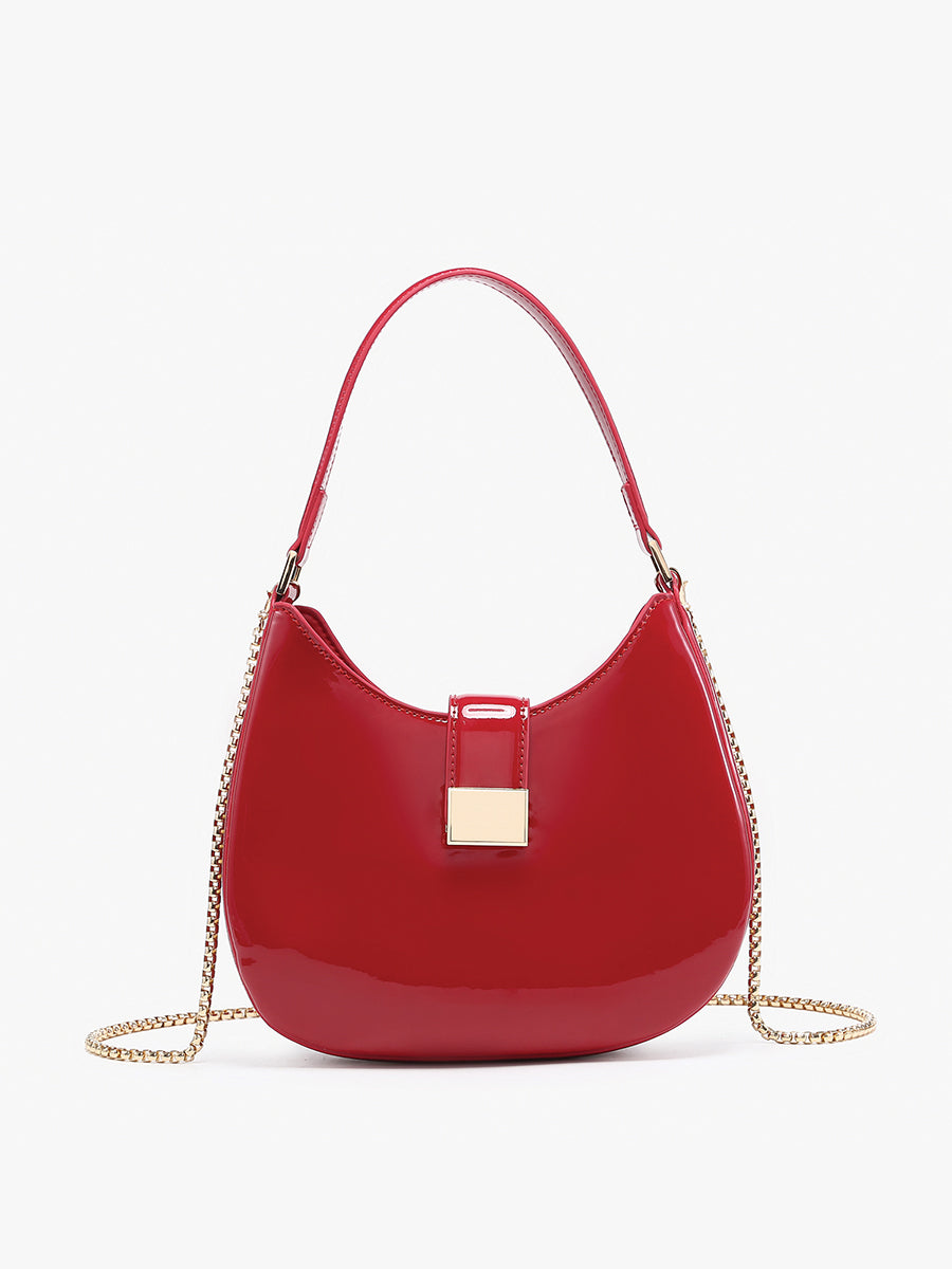 High-gloss curved design with a metal accent snap closure for a glamorous touch.
