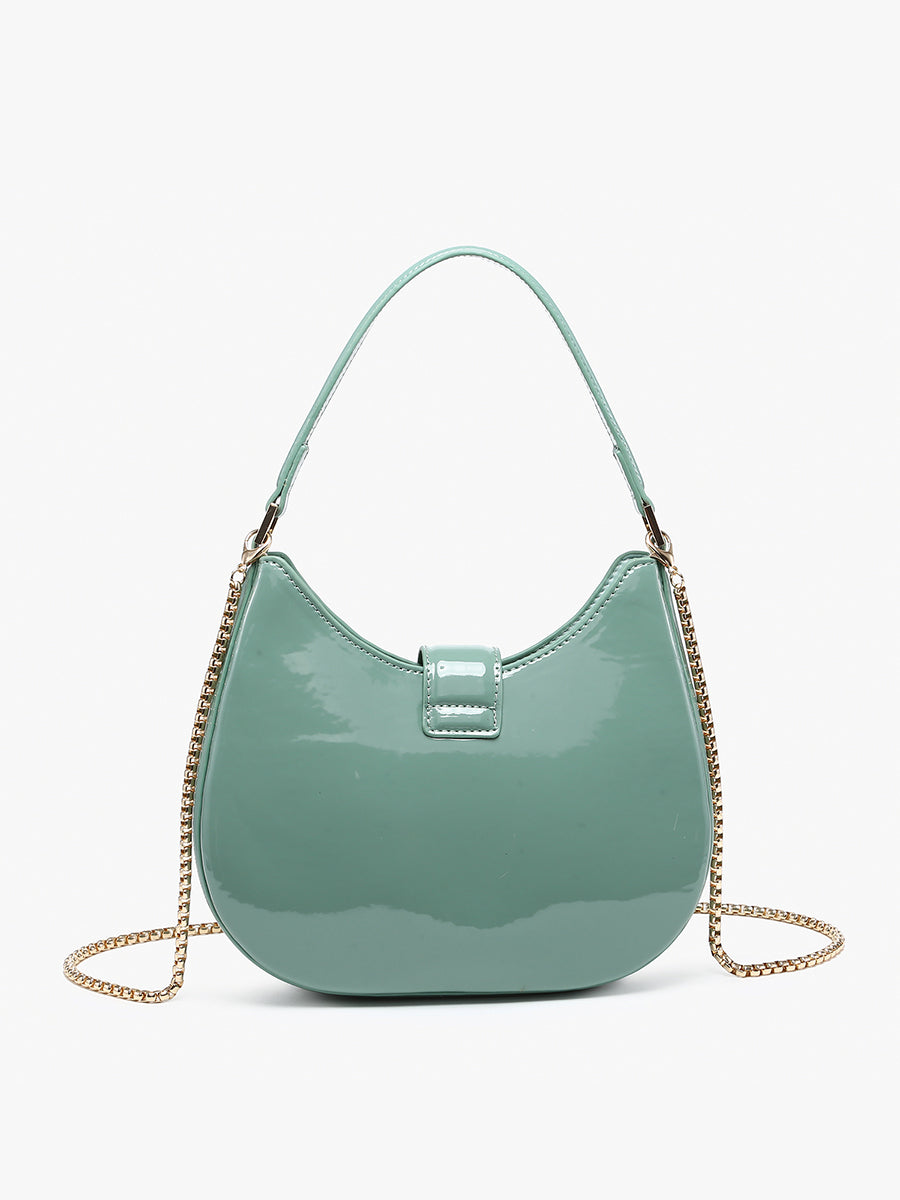The Malta Shaped Crossbody/Saddle Bag is a chic and sophisticated accessory crafted from premium vegan leather. Featuring a high-gloss curved design and a metal accent snap closure, this shoulder bag adds a touch of glamour to any outfit. Its removable gold chain strap allows for versatile styling, making it perfect for both formal and casual occasions.