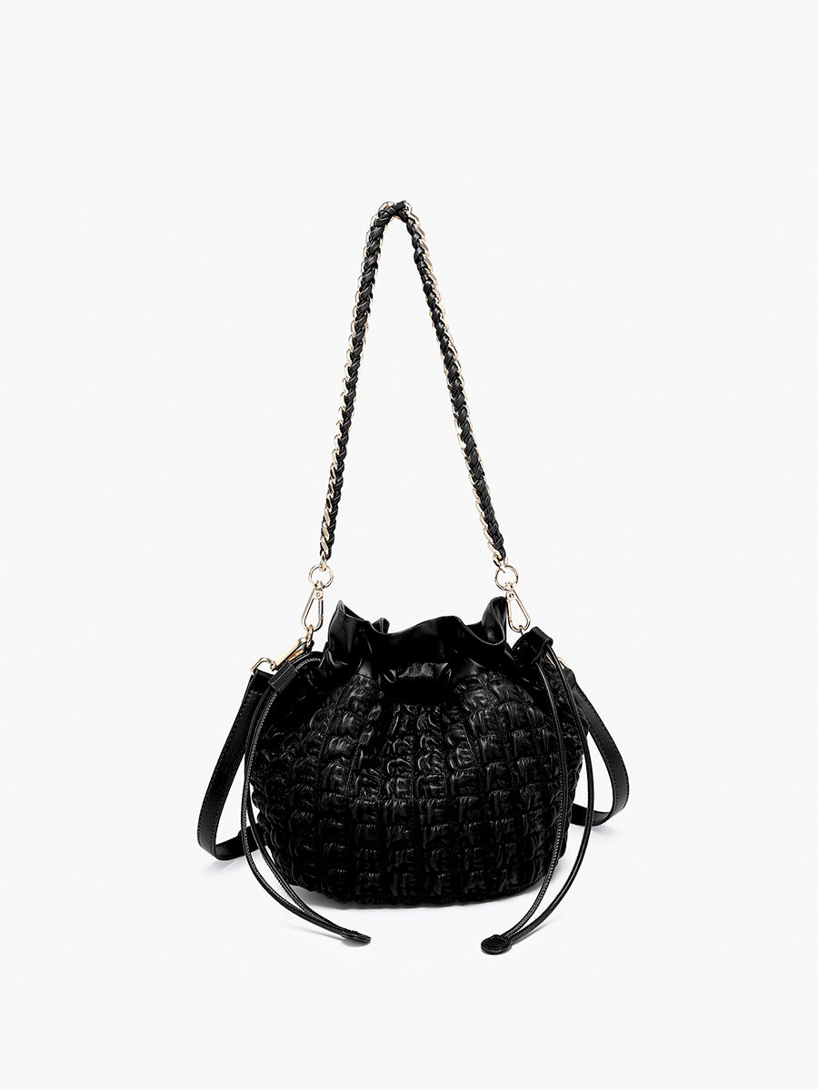 The Berlin Quilted Ruched Bucket Bag is designed with a quilted, ruched texture and a practical drawstring closure. This versatile bag comes with a removable chain shoulder strap and an adjustable/removable crossbody strap, making it ideal for both day and evening wear.