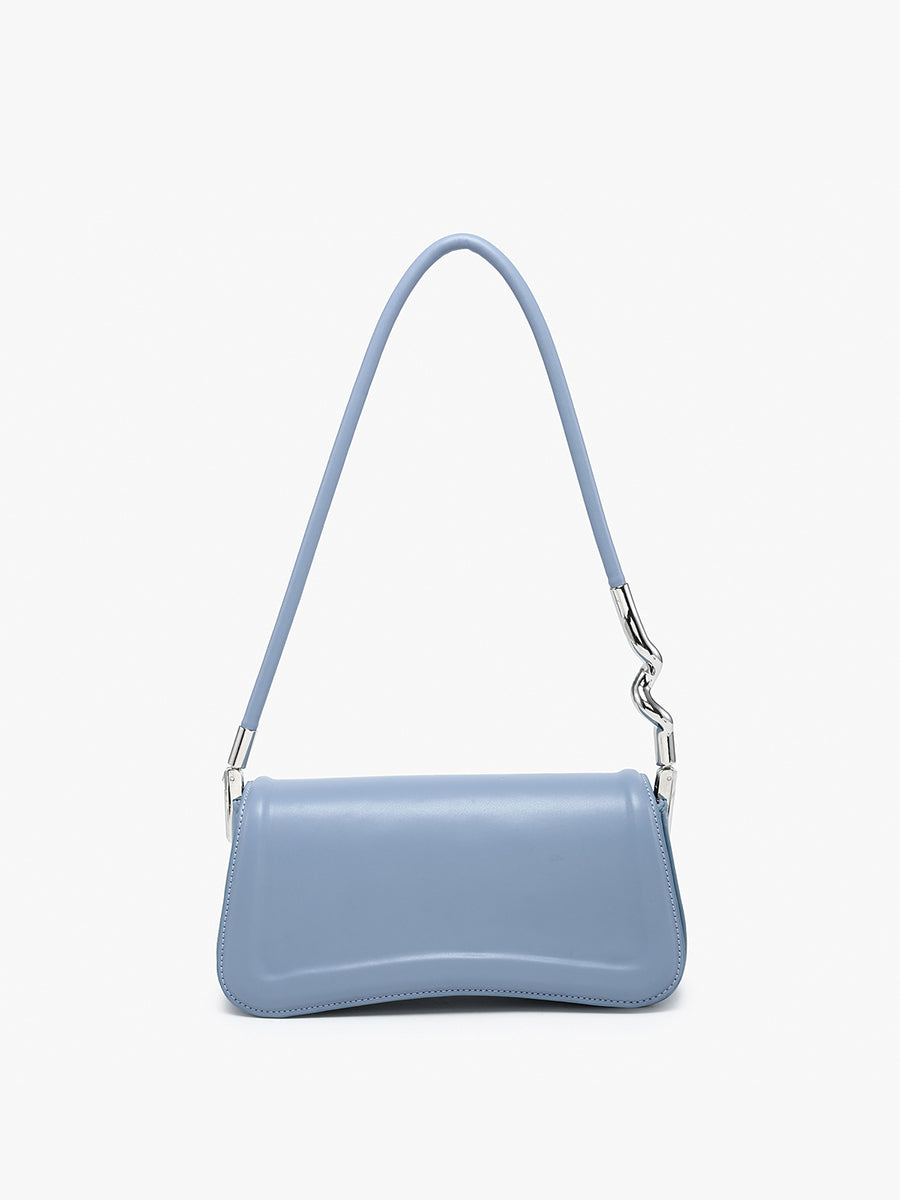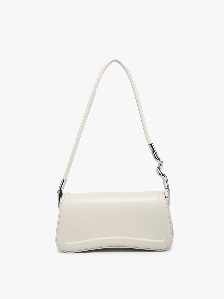 The Toronto Detailed Edge Shoulder Bag blends modern elegance with a distinctive design. Featuring a curved silhouette, snap and zip closures, and a strap adorned with wavy metal accents, this shoulder bag offers both style and functionality.