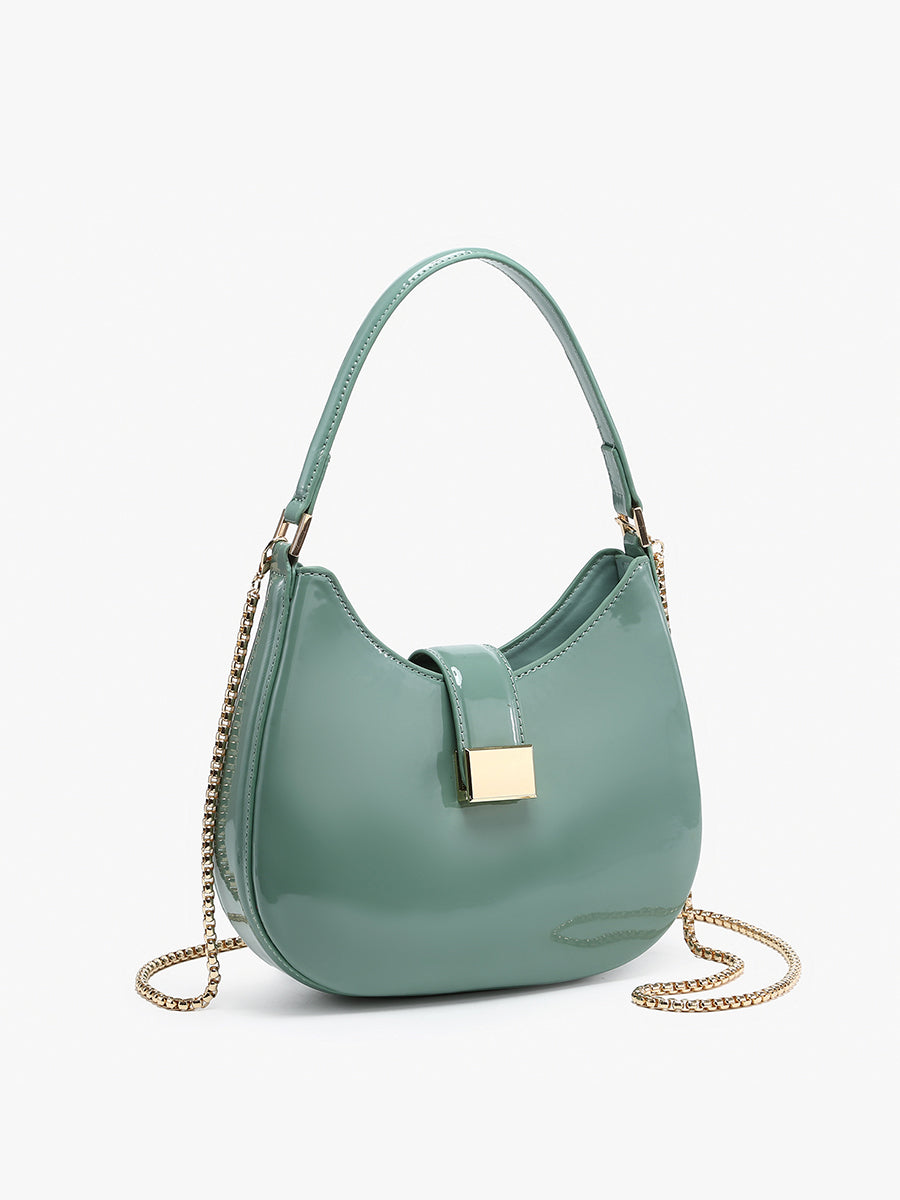 The Malta Shaped Crossbody/Saddle Bag is a chic and sophisticated accessory crafted from premium vegan leather. Featuring a high-gloss curved design and a metal accent snap closure, this shoulder bag adds a touch of glamour to any outfit. Its removable gold chain strap allows for versatile styling, making it perfect for both formal and casual occasions.