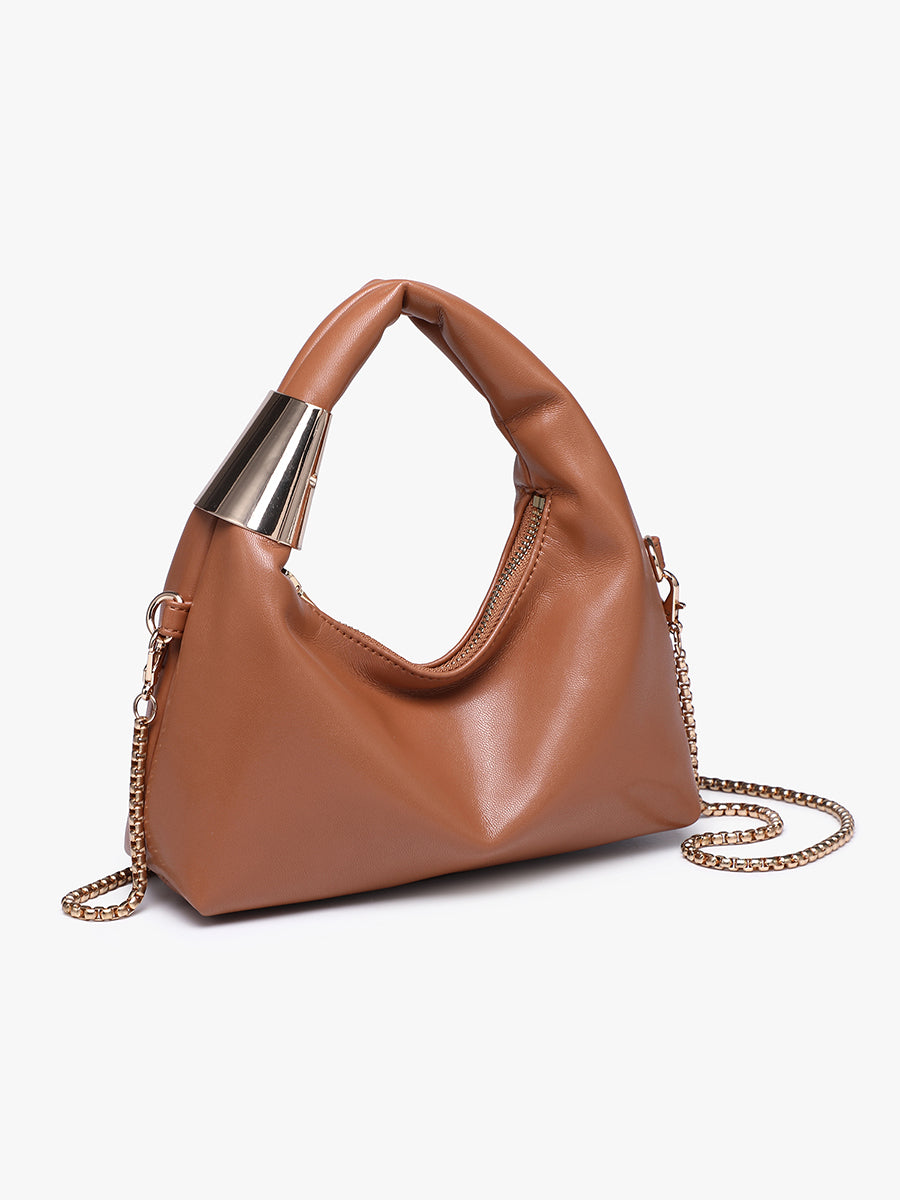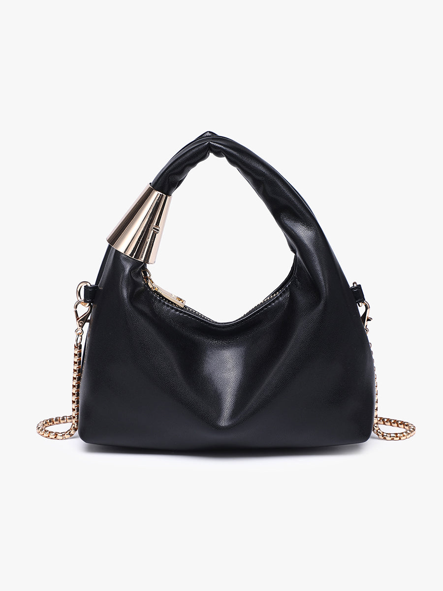 Meet the Rosario Clutch/Crossbody. Designed with a sleek silhouette, and a decorative metal-adorned handle for a sculptural finish. Complete with a top zip closure and a removable gold chain strap.