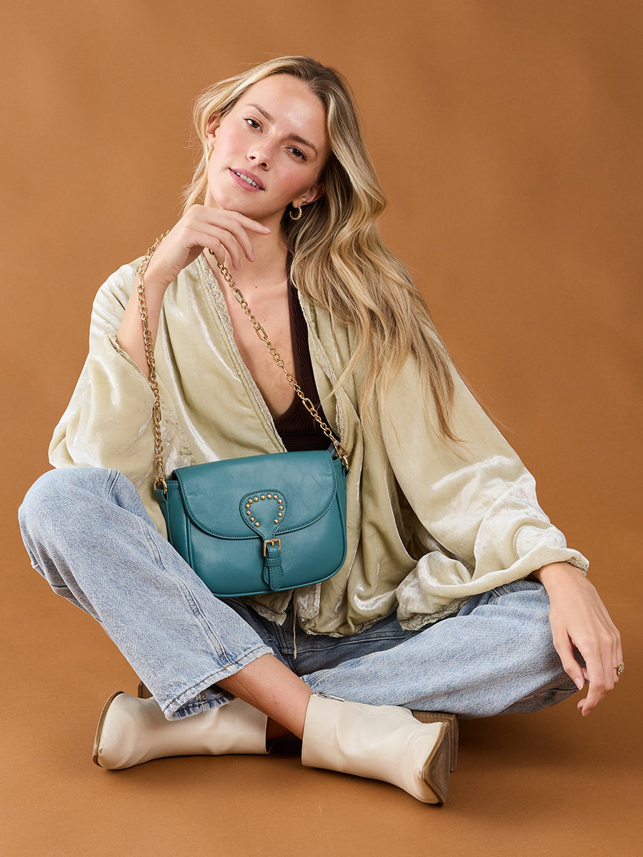 Flapover snap closure with stud detailing for a stylish touch.
