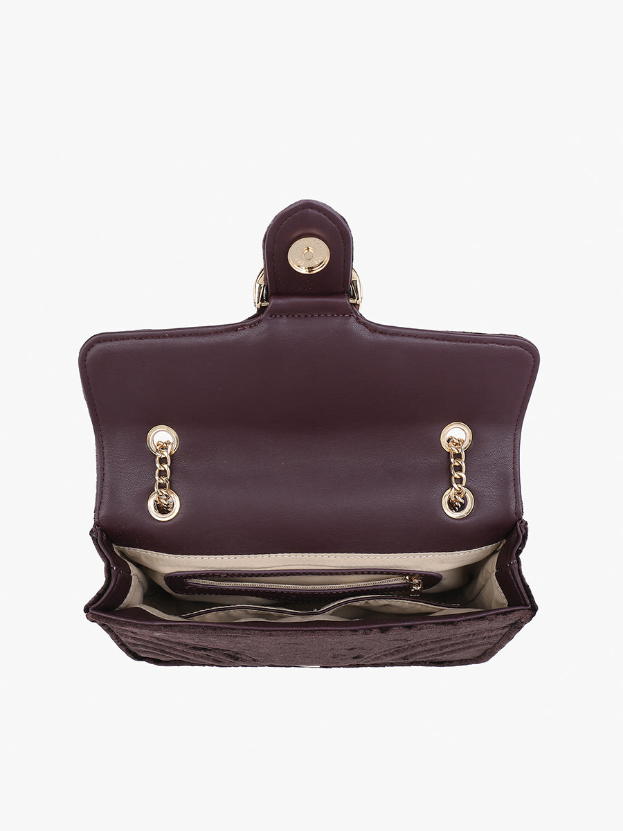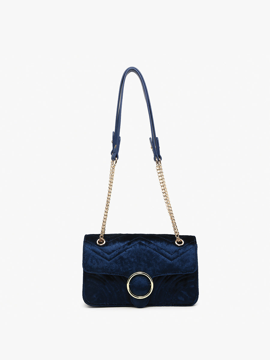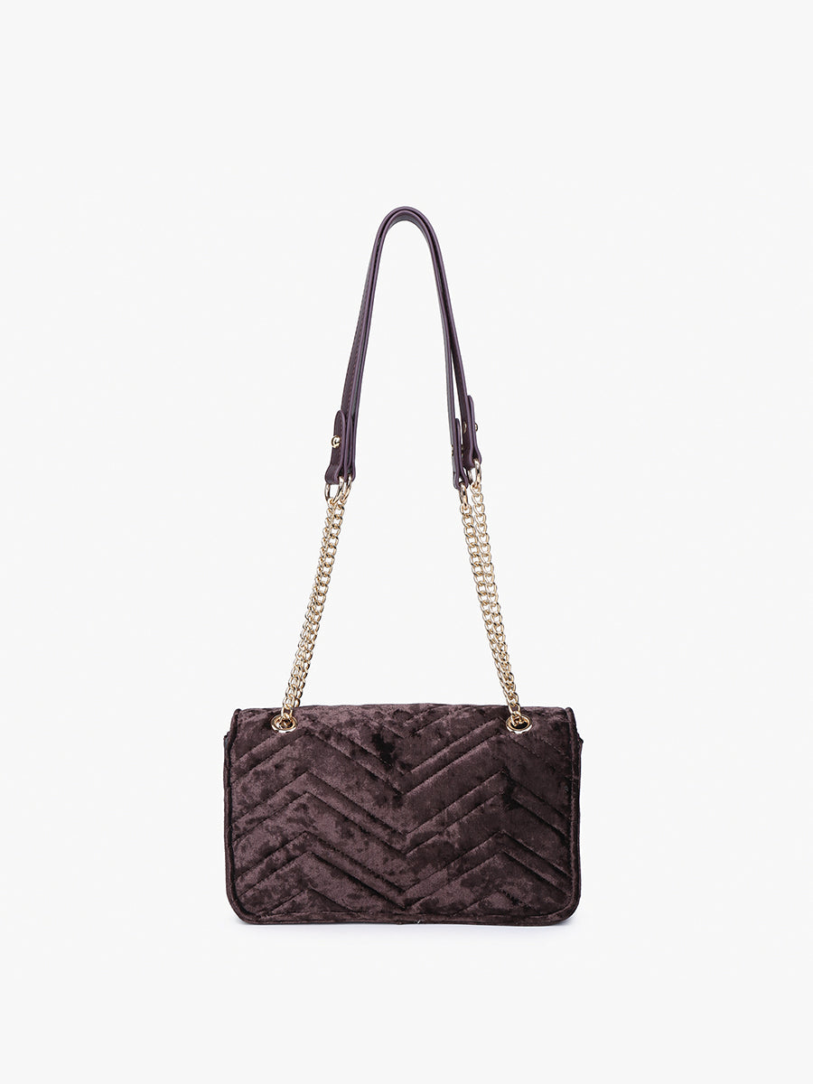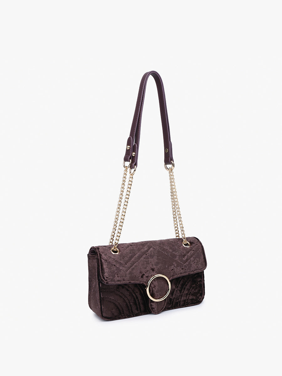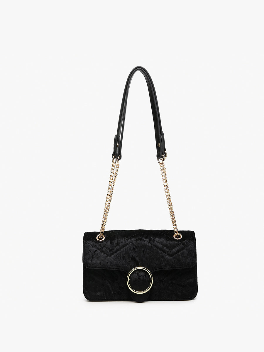 The Edinburgh Soft Textured Crossbody exudes luxury with its quilted velvet design and gold chain strap. Featuring a snap closure with a distinctive circle metal accent, this shoulder bag offers a sophisticated touch and versatile styling options.